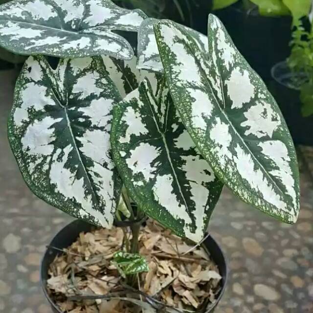 Tanaman hias Alocasia Frydek Keladi NeonRp27000. Tanaman hias keladi wayang batikRp30000. Pertumbuhannya sangat mudah dan sangat menyukai cahaya matahari penuh.